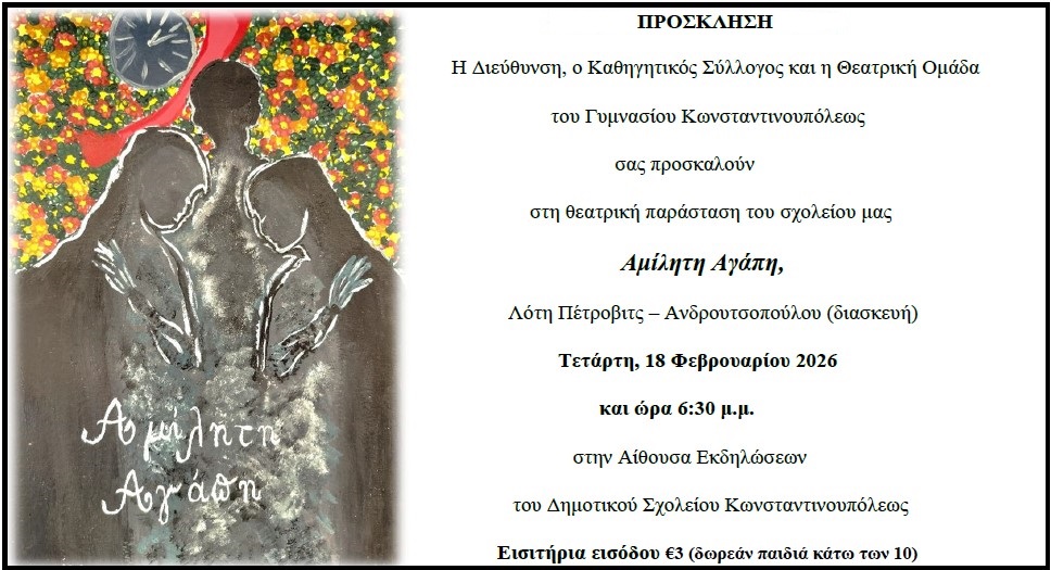 Στιγμιότυπα από τη βραδινή θεατρική παράσταση "Αμίλητη Αγάπη" που παρουσίασε η θεατρική ομάδα του Σχολείου μας στην αίθουσα πολλαπλής χρήσης του Δημοτικού Σχολείου Κωνσταντινουπόλεως στις 18 Φεβρουαρίου 2026.