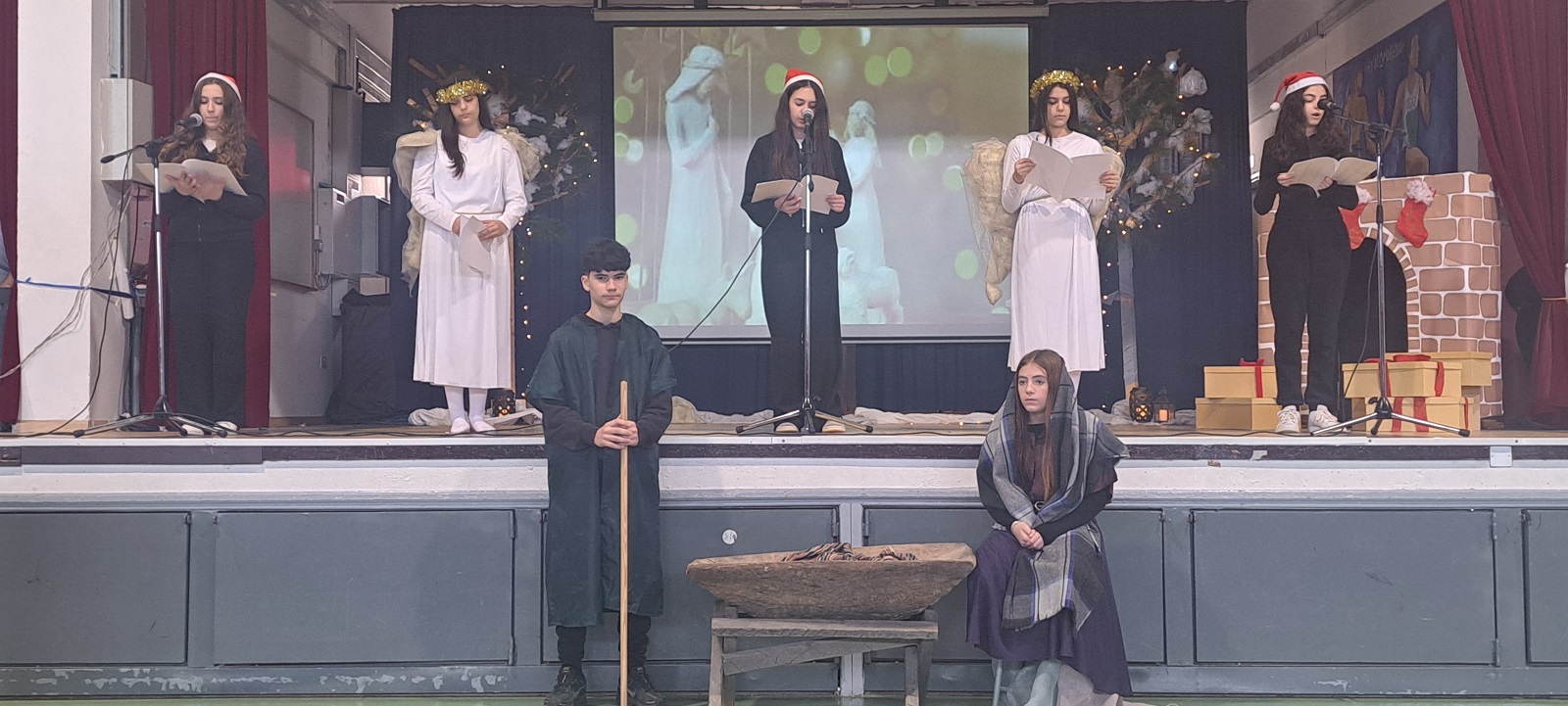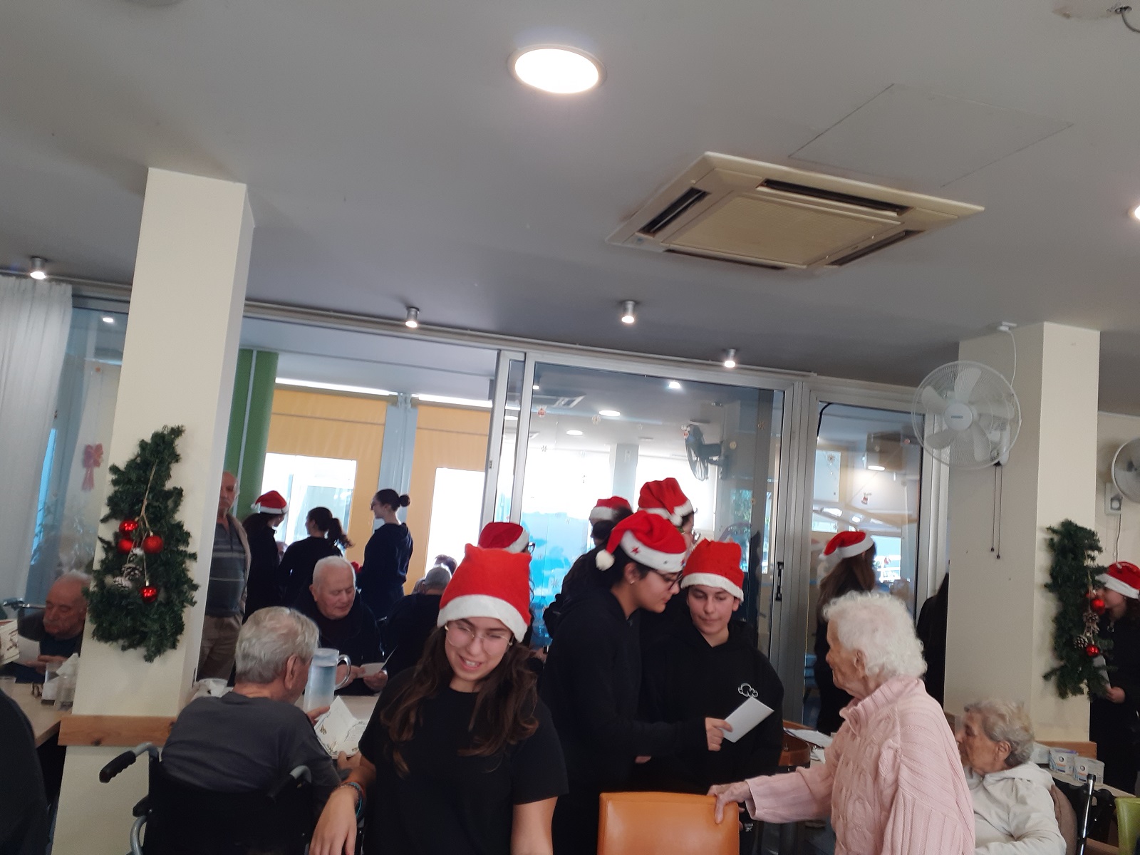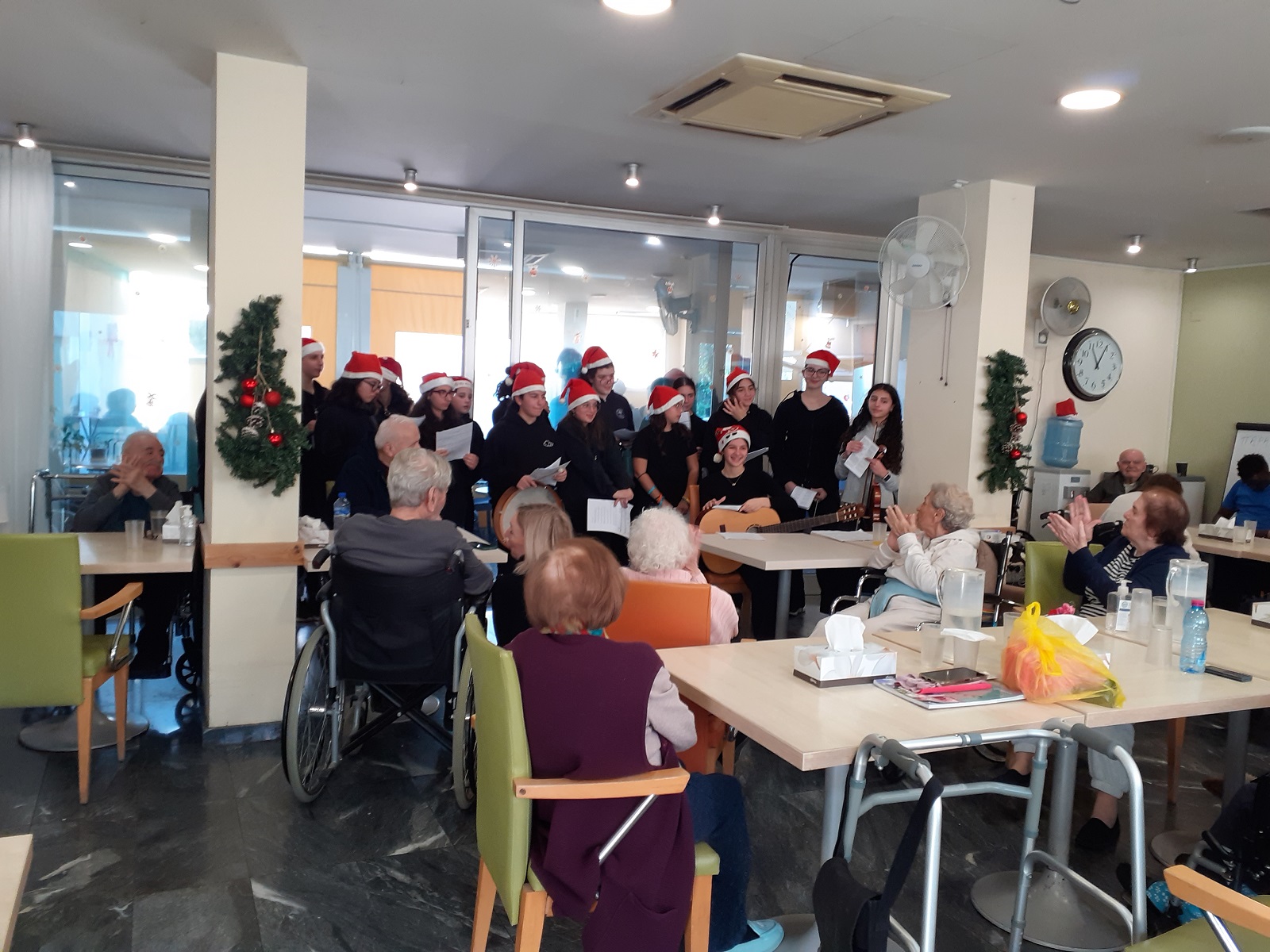 | Η Ομάδα Αλληλεγγύης και παιδιά της χορωδίας επισκέφτηκαν τον Όμιλο «Ματέρια» και το Γηροκομείο «Χρυσή ηλικία». Έψαλλαν τα Κάλαντα στους ηλικιωμένους και τους πρόσφεραν χριστουγεννιάτικες κάρτες με ευχές. |