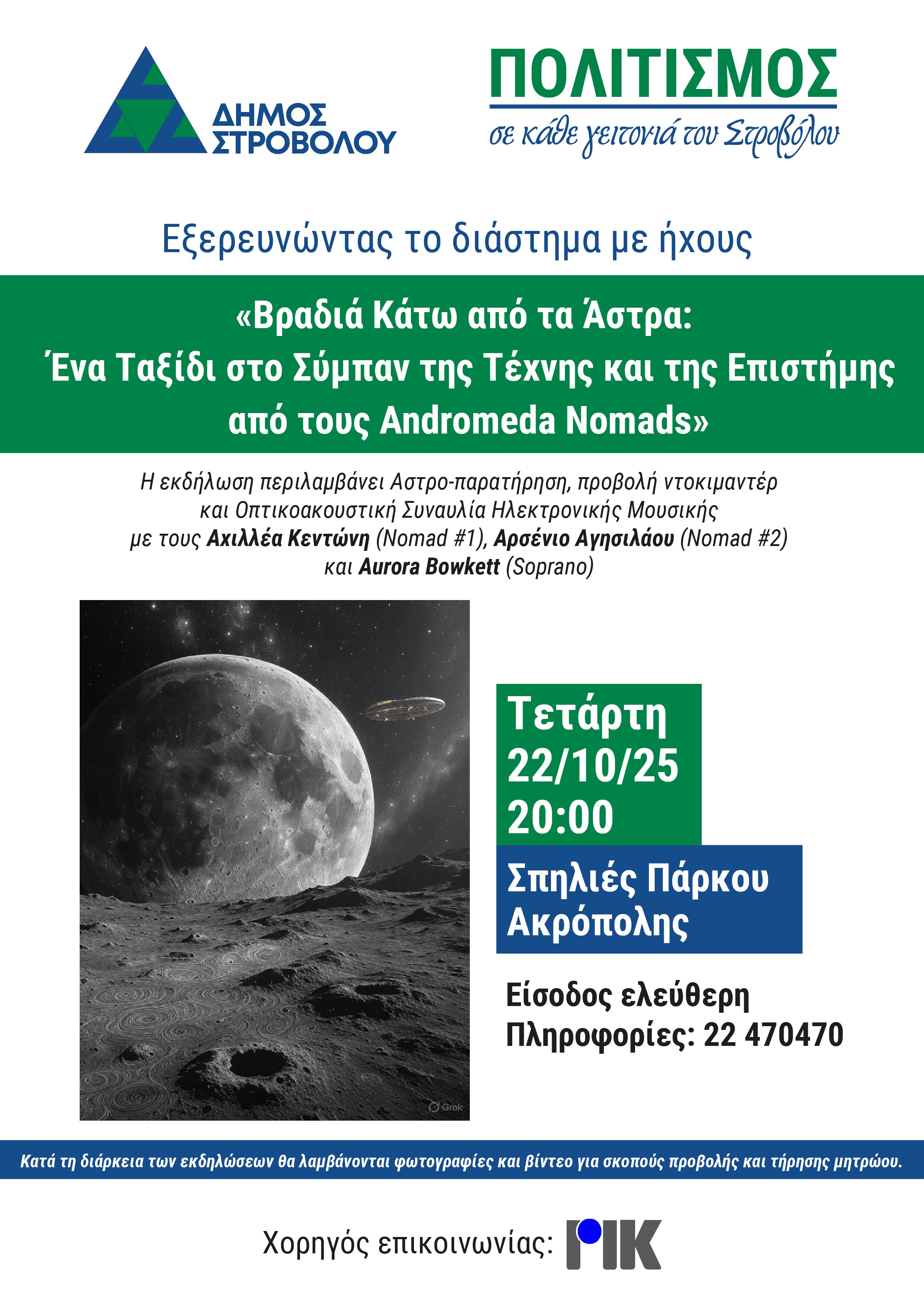 Βραδιά Κάτω από τα Άστρα. Ένα Ταξίδι στο Σύμπαν της Τέχνης και της Επιστήμης από τους Andromeda Nomads» την Τετάρτη 22 Οκτωβρίου 2025. Δελτίο τύπου. Αφίσα |