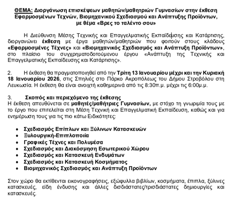 - Έκθεση με θέμα «Βρες το ταλέντο σου» 13 μέχρι 18 Ιανουαρίου 2026
