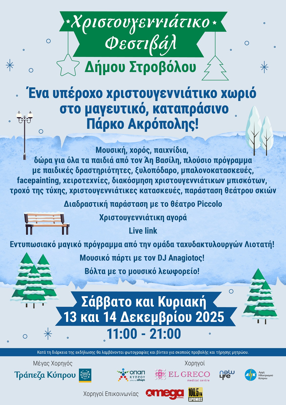 | Χριστουγεννιάτικο Φεστιβάλ Δήμου Στροβόλου στο Πάρκο Ακρόπολης στις 13 και 14 Δεκεμβρίου 2025. Δελτίο Τύπου. Αφίσα. |