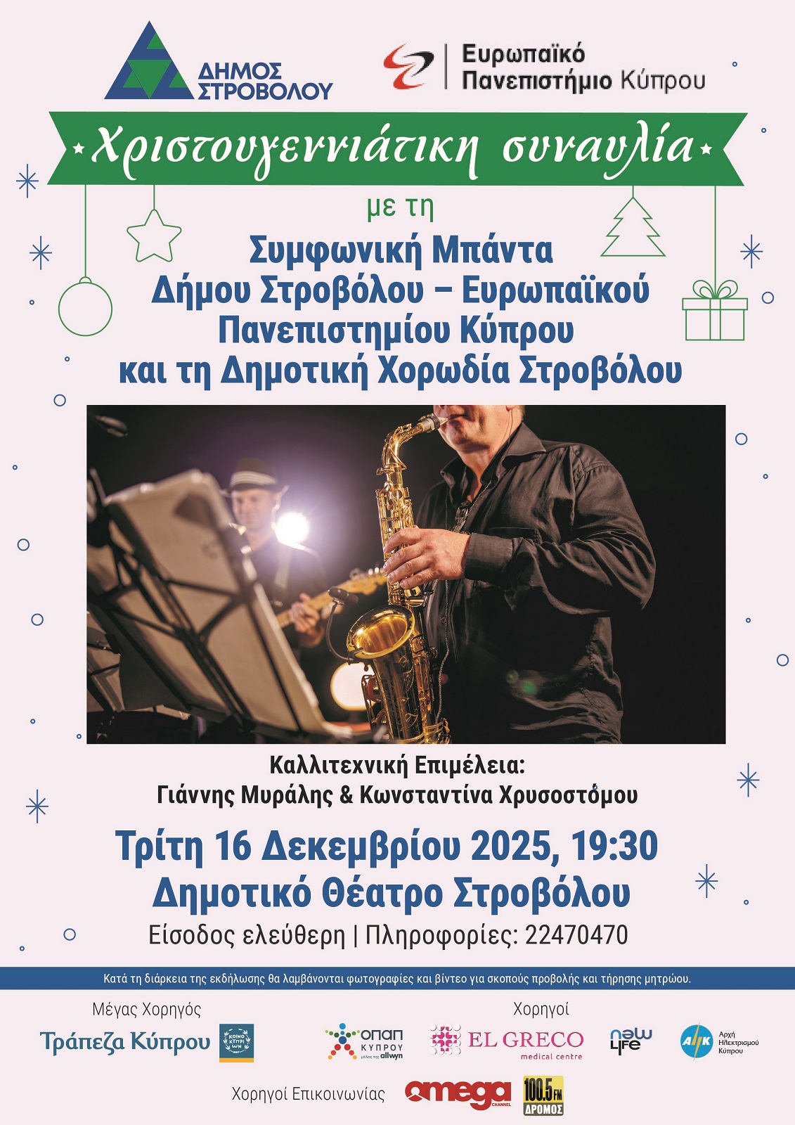 | Χριστουγεννιάτικη συναυλία με τη Συμφωνική Μπάντα Δήμου Στροβόλου – Ευρωπαϊκού Πανεπιστημίου Κύπρου και τη Δημοτική Χορωδία Στροβόλου την Τρίτη 16 Δεκεμβρίου στις 19:30 στο Δημοτικό Θέατρο. Δελτίο Τύπου. Αφίσα. |